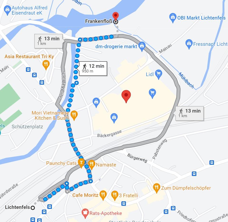 Fußweg vom Bahnhof Lichtenfels zum Floß beträgt nur ca.